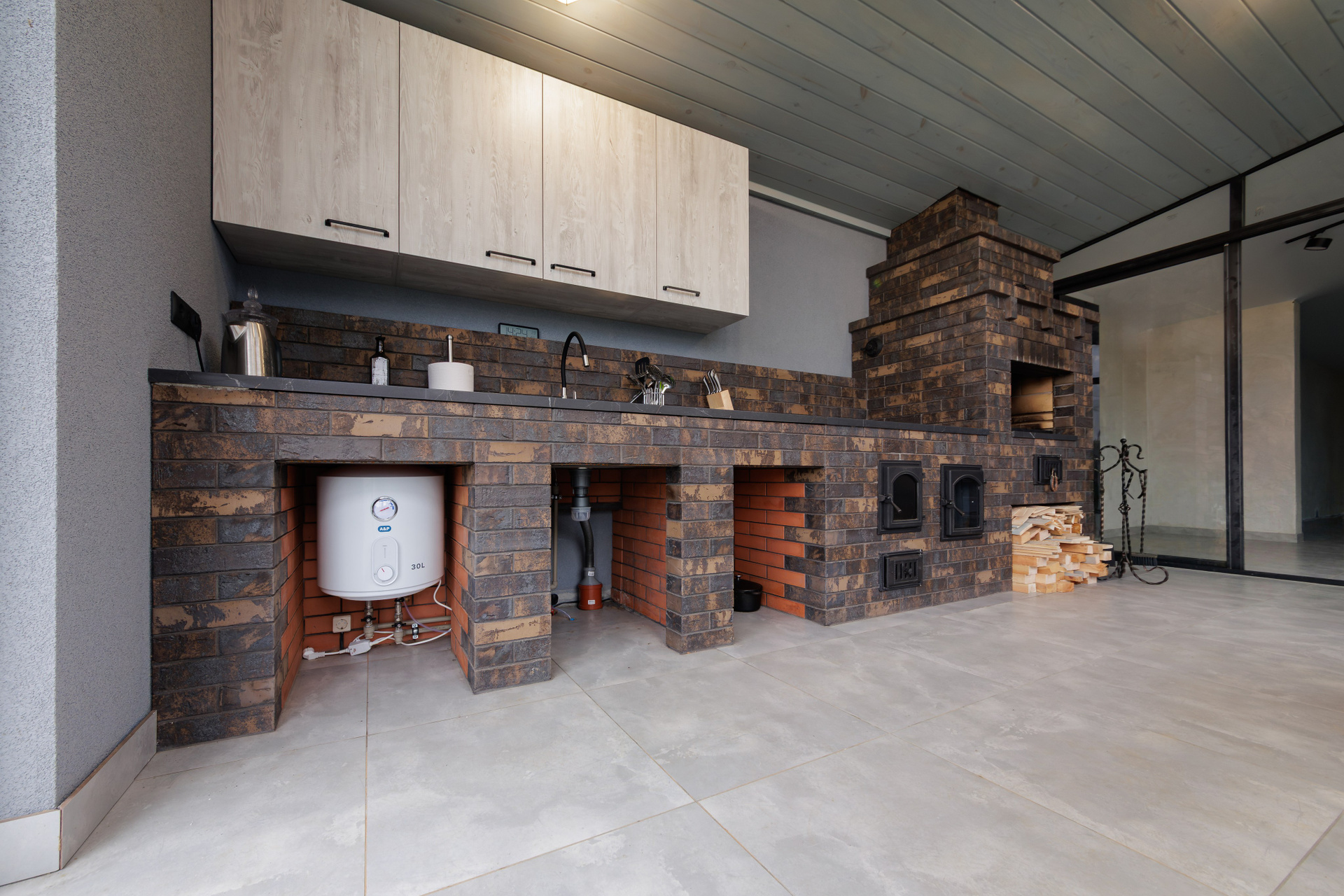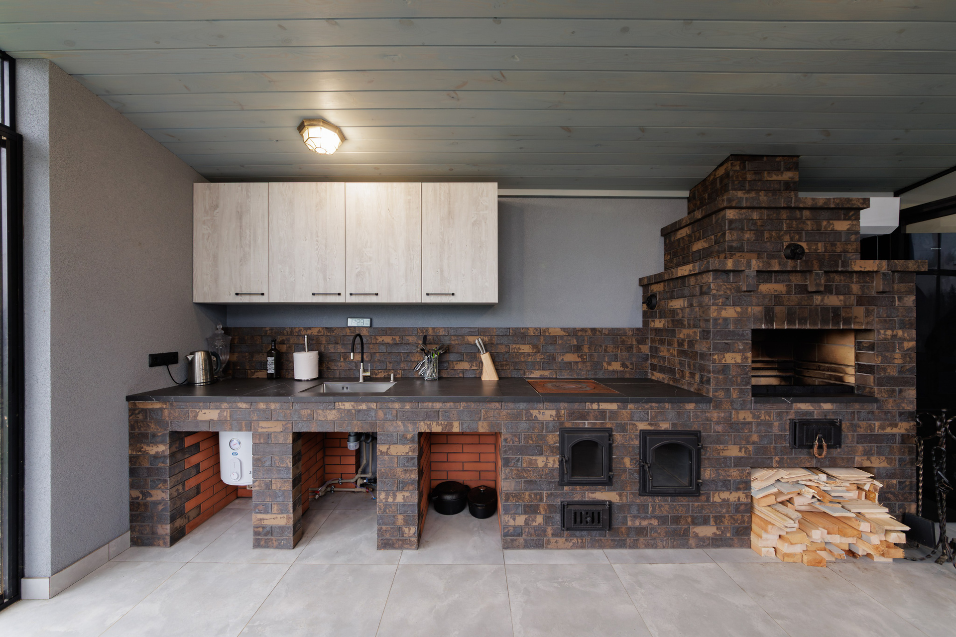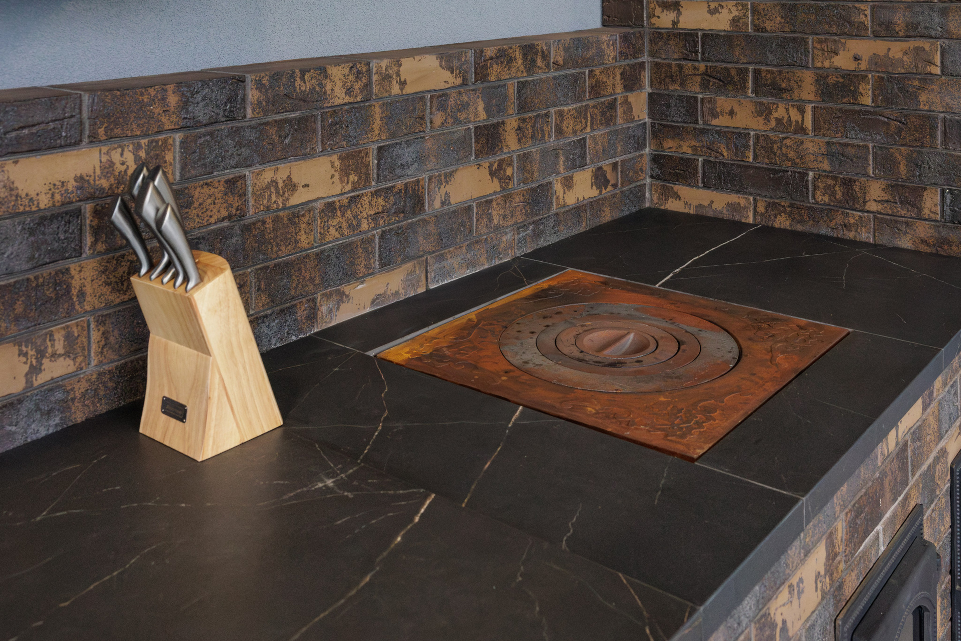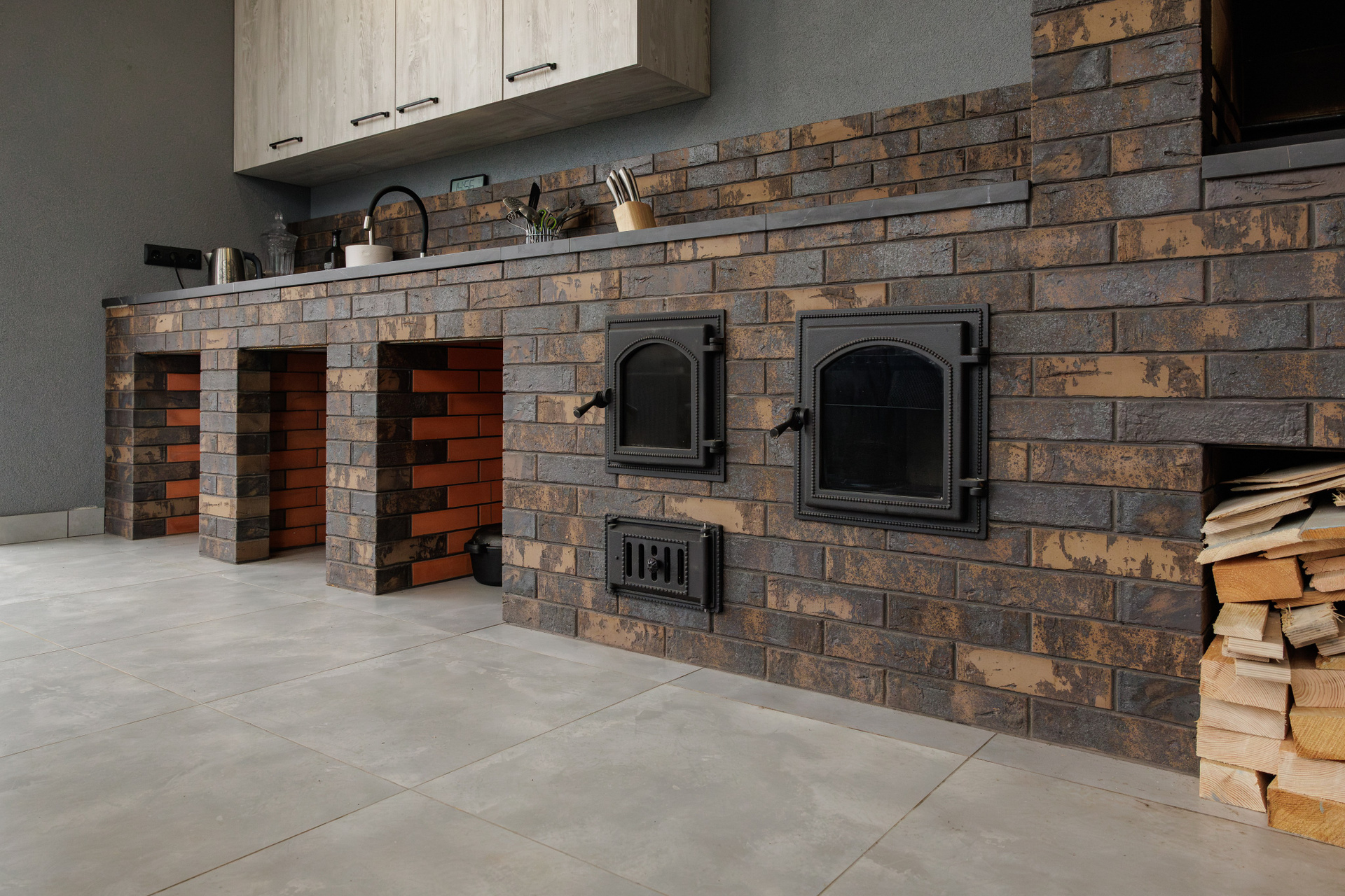Съемка кухни с печью из керамического лицевого кирпича